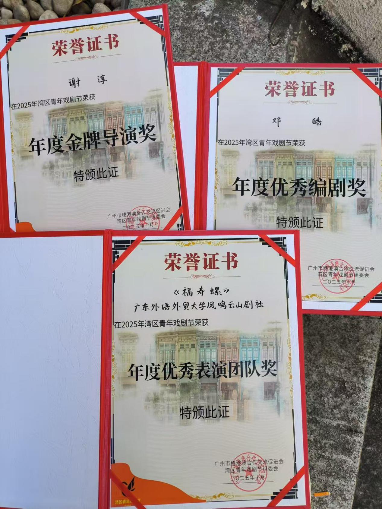 在本届戏剧节中,由广东外语外贸大学凤鸣云山剧社选送、邓皓编剧、谢淳执导的原创剧目《福寿螺》表现优异,斩获多项荣誉。该剧荣获“年度优秀表演团队奖”,编剧邓皓获“年度优秀编剧奖”,导演谢淳获“年度金牌导演奖”,主演成晔获“年度优秀演员奖”。