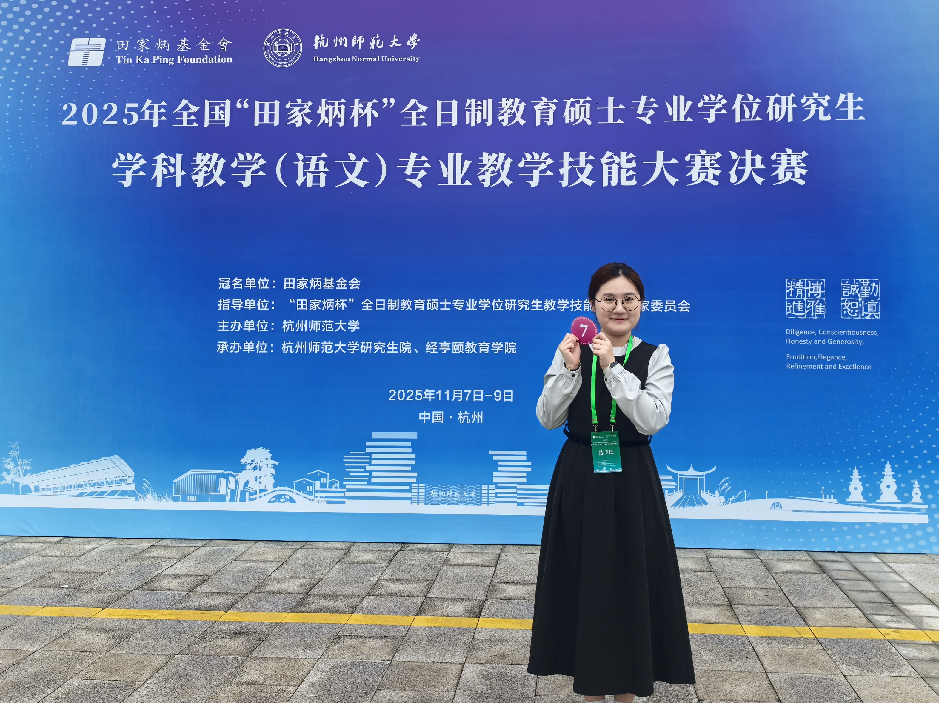 11月7-9日,2025年“田家炳杯”全日制教育硕士专业学位研究生学科教学(语文)专业教学技能大赛决赛在杭州师范大学举行,来自全国120多所学校的170多名研究生进入决赛。大赛以决赛选手总数为基数,共评出一等奖、二等奖、三等奖、优秀教学设计奖各约占10%、20%、30%、40%。我院2024级学科教学(语文)专业研究生邱菡同学参加了决赛,经过认真的设计、讲课和答辩等环节,最终荣获三等奖。