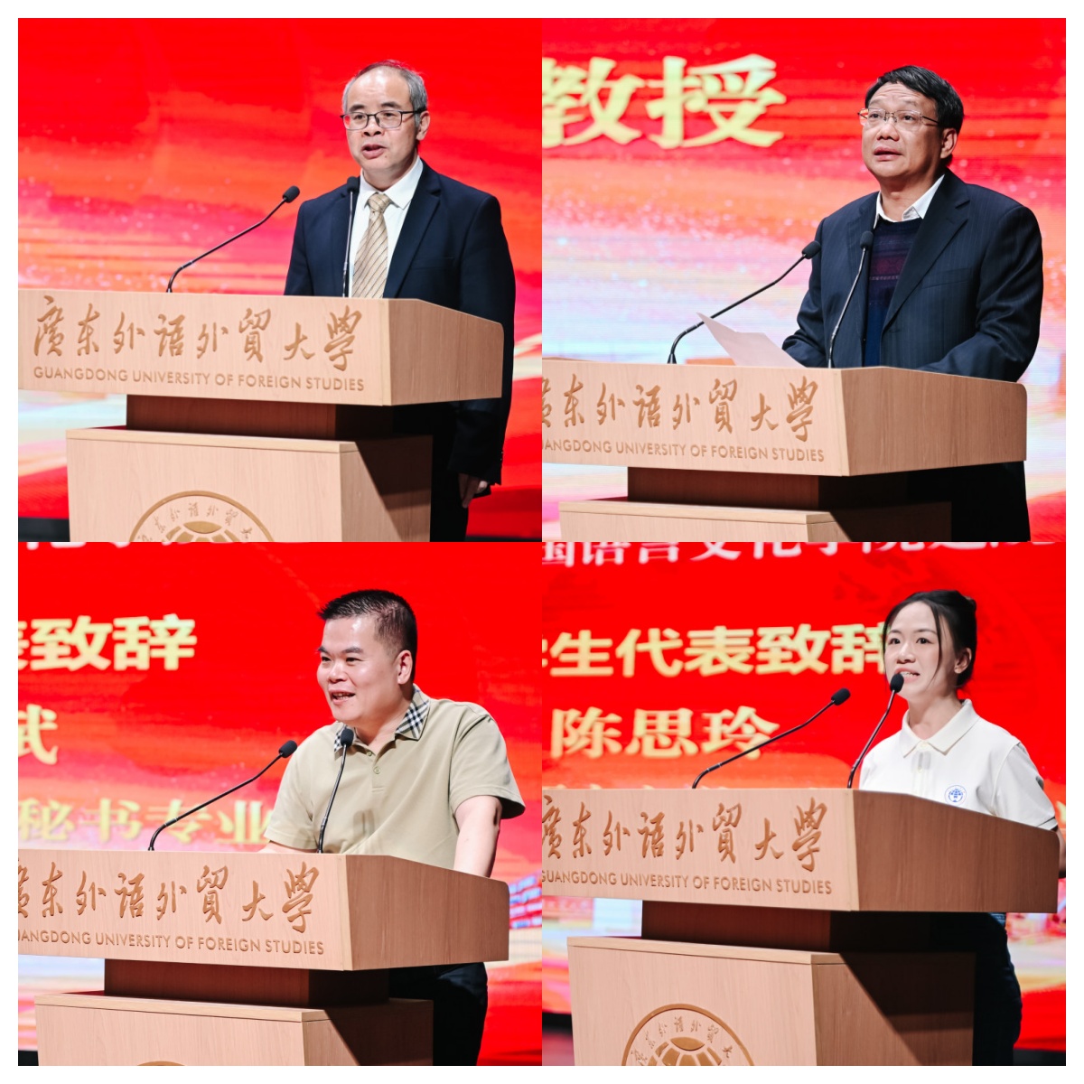 中文学院院长陈恩维教授回顾了学院20年发展历程,指出学院20年来以学科建设为龙头,以科研创新为动力,培养了一大批优秀人才,举办了一系列高水平学术会议,构建了完善的国际中文教育体系,国际中文教学志愿者足迹遍布58个国家和地区,成为中华文化国际传播的重要力量。为响应国家文化强国建设号召,学院未来将聚焦“学科引领、人才培养、文化传播”,不断强化学院的建设。教师代表严修鸿教授分享了与学院共同成长的经历,表达了对学院、时代、同事和学生的感激之情,以及对学院美好前景的坚定信心。1991级校友郭楚斌代表发言,分享了在校求学的珍贵记忆,表达了“一段广外路,一生广外情”的真挚感情。2022级汉语言文学(师范)专业的陈思玲同学作为学生代表,以《当“我们”的二十岁,遇见“你”的二十岁》为题,表达了传承学院精神的决心。