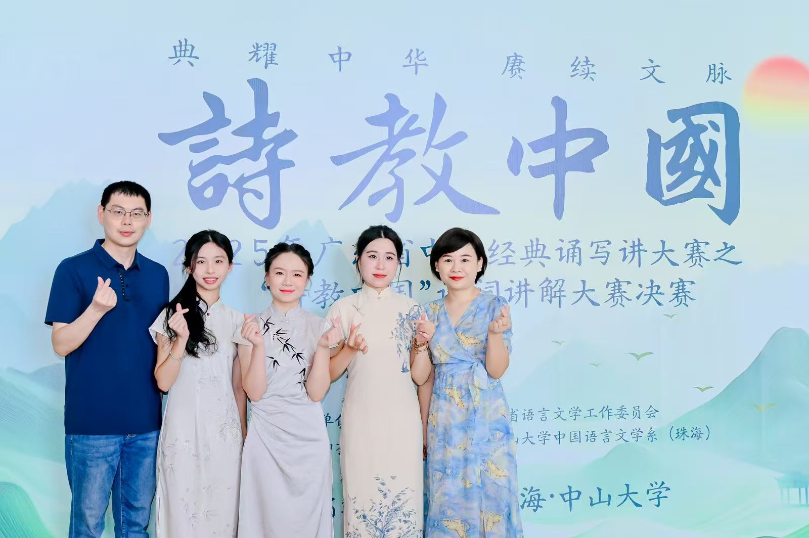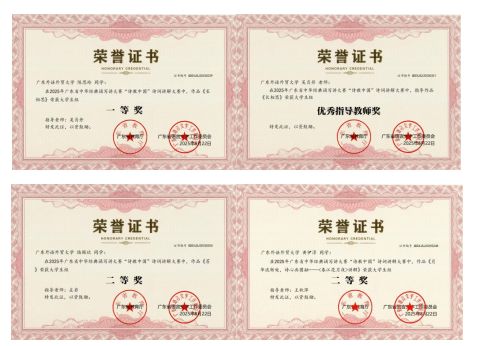在备赛全程中,中文学院左岩、吴肖丹、王秋萍三位老师组成专业指导团队,围绕诗词解读、表达技巧与多媒体呈现等方面,为选手提供了系统化、个性化的指导,师生们反复推敲、精益求精。2025年5月,参赛选手赴中山大学(珠海校区)参加广东省中华经典诵写讲大赛“诗教中国”诗词讲解大赛决赛,在现场讲解中沉着自信、表现优异,最终陈思玲同学获得省级一等奖,陆颖欣、黄伊淳同学分获省级二等奖,吴肖丹副教授获评“省级优秀指导教师”。