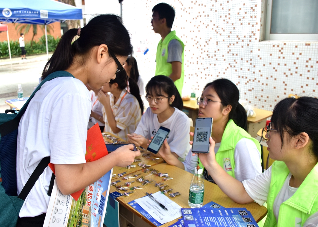 志愿者的身影在校园里穿梭,为新生和家长提供及时有效的帮助。迎新志愿者、大二学生席同学介绍,今年的志愿服务筹备工作早早开展,所有的志愿者都提前来到学校接受培训,“我们希望能够尽自己最大的努力去帮助新生和家长。” 值得一提的是,今年还有19级的新生作为志愿者在校园内进行志愿服务。来自黑龙江的中文学院新生王同学就是其中的一员,“我觉得这个活动很有意义,也给了我一个很好的锻炼自己的机会。作为一名新生,在帮助别人的同时我也收获了赞许和感谢,这让我感到非常满足和快乐,也更加深对校园的归属感。”来自韶关的翻译学院新生家长王女士表示,学校的志愿者们为她提供了非常多的帮助,很感谢大家。