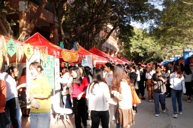 本届中国文化节以“与诗相携,诵我佳节”为主题,选取春节、端午、元宵、七夕、中秋、清明六大重要节日,从“爆竹声中一岁除”到“清明时节雨纷纷”,横贯日月变迁,展现多样庆祝方式,描摹出浩大、热闹非凡的佳节图景。同时还设置了展览摊位,针对其主题节日开发设计了一系列诗词游戏,增加民俗体验环节,如“诗词+习俗”“诗词+美食”等,兼具知识性与趣味性,极大地吸引了同学们的兴趣,使其自觉参与到传统文化的保护与传承中来。“各美其美,美美与共”,依托学校办学优势,加强中外文化交流,本届文化节特邀学校留学生社团作为嘉宾摊位,越南春卷、可丽饼、马卡龙等外国美食成为传统文化长廊中一抹亮眼的色彩。此外,广外南粤古驿道艺术文化研究中心团队亦受邀参加,其通过“古道风采”的“观、听、闻、尝”,让古驿道的风景、味道和历史走进校园,让更多同学认识、了解了这一宝贵的文化遗珠。