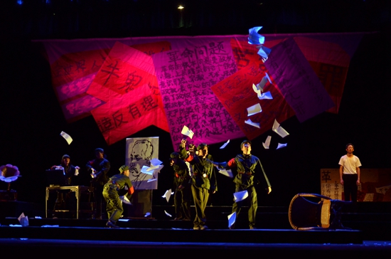舞台交错晃动的光束以及红卫兵高呼的口号把全剧推向了高潮。在文革中,这样一位爱国的才华横溢的斗士受尽苦楚。红卫兵把书桌上的书和译稿撕烂,大叫:“烧掉,全部烧掉!”甘少苏跪在地上哭嚎,捡起被撕烂的书稿,却被老年梁宗岱无奈地制止:“少苏,别捡了。”此时,不同时空的梁宗岱同时出现在舞台上,红卫兵抢夺走青年梁宗岱手中的书稿,徒留青年梁宗岱一声悲愤的感慨:“诗歌,如今是最没用的东西!”而中年梁宗岱苦笑着仰天长啸:“人有病,天知否?”老年梁宗岱耷拉着头,无奈地感叹道:“现在我才知道,文学是有罪的。”短短几句台词,道不尽的是梁宗岱理想陨落的心酸。