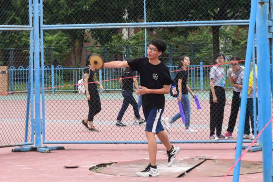 径赛精彩纷呈,田赛亦紧张激烈。来自文管15的李卓佳手中紧握着重达7.26公斤的铅球,置于右侧脖子,双眼注视前方,毫不犹豫又游刃有余地将其扔出,以7.56米的成绩取得男子铅球的冠军。而在之后的男子铁饼比赛中,来自文管14的刘源,在圆圈内一个缓冲,潇洒向外甩出铁饼,以14.62的成绩勇夺桂冠。