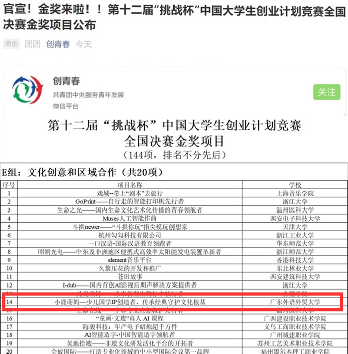 广东外语外贸大学中国语言文化学院培育的“小鹿萌妈——少儿国学 IP 创造者,传承经典守护文化根基” 项目获得第十二届“挑战杯”中国大学生创业计划竞赛全国金奖,是继团队获得第六届中国国际“互联网+”大学生创新创业国赛金奖后的又一突破。“小鹿萌妈”项目成为“互联网+”和“挑战杯”国赛的 “双金”团队,再创广外历史。