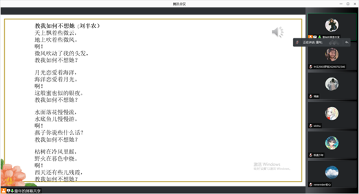 本课题主要涉及经典诗歌的欣赏及诵读。教学组成员们为同学们讲解了古诗《满江红》以及现代诗《教我如何不想她》,并引导学生们有感情地进行朗诵,目的是提高同学们的朗诵能力,加深同学们对中国诗歌文化的认识。