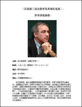 12月14日至22日,法国著名汉学家、汉语教学专家白乐桑教授即将到校,受聘我校客座教授,并为汉语国际教育中心师生带来《汉语第二语言教学及其增长危机》、《法国汉语教学现状与问题》、《学习动机——以法国汉语学习者为例》、《中法语言政策比较》、《法国汉语教育史及其文化背景》等精彩的学术报告。