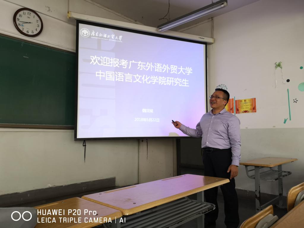 22日晚,魏慧斌来到兰州交通大学文学与国际汉学院,在该院夏副书记和李凌晏老师的精心安排下,于第七教学楼1801教室,面向该院汉语言文学和汉语国际教育专业的大三学生开展宣讲。魏慧斌播放了学院的招生宣传片,分发了有关资料,并播放PPT进行了详细宣讲。随后,魏慧斌就同学们关心的生源录取率、初试参考书目、学费、奖贷助学体系、住宿条件、国际交流等问题,做了详细解答。