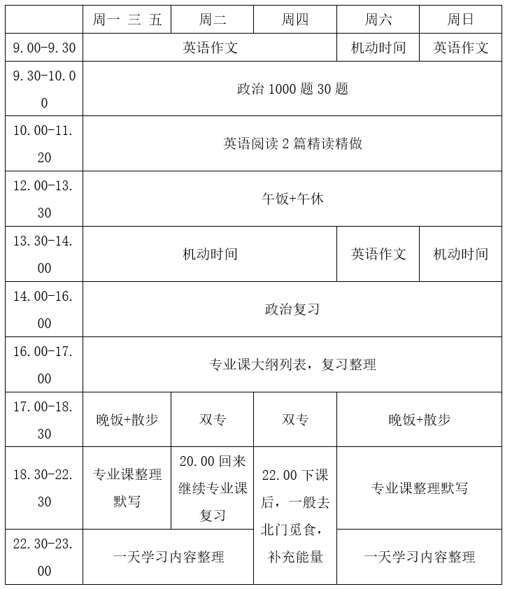 因为谢雅婷有双专课程需要学习,因而她在时间安排和协调上做出了自己独特的安排。她把自己的时间和复习内容进行了具体的量化。谢雅婷专门制作了一份适合自己的复习日程表,较为详细具体安排了每日具体学习内容,又留下了足够的弹性空间。谢雅婷强调在复习过程中,不能把自己压的过紧,过紧的复习日程容易让人产生厌倦感和放弃的想法,时不时给自己一些机动时间去处理突发事件或者调适心情,有助于在考研过程中保持身心愉快。