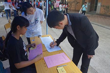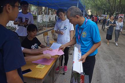上午八点半左右,中文学院迎来了第一位前来报到的校友——2011级对外汉语专业的邓文君。之后陆续有很多校友前来签到,他们的脸上都洋溢着欣喜的笑容,场面热闹不已。学院党委副书记李江来到了签到处视察慰问,并和回校的校友亲切交谈。直到下午4时,签到处共接待了近三百位校友。志愿者们工作虽然辛苦,但热情的笑容,耐心的引导却一如既往,展现了中文学子的良好风貌。